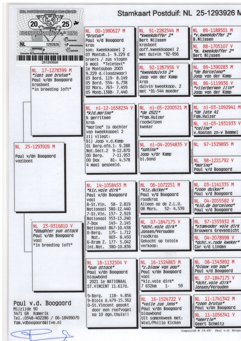 Over the years, Paul has patiently and strategically built an outstanding strain of racing pigeons based on pure quality and proven performance. Among the most important foundation pigeons in his loft are the legendary Brutus and Misty, two top-class breeders that have significantly strengthened the overall genetic power of the colony. In all key pigeons, one will consistently find the influence of Breeding Pair 1 and Breeding Pair 2, the true pillars of this elite line. Through carefully selected introductions of new blood, Paul has always managed to give his colony fresh impulses while preserving its genetic identity.