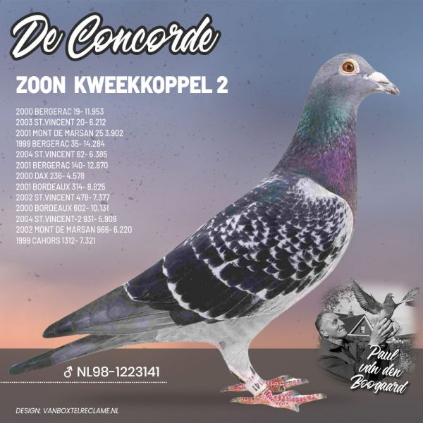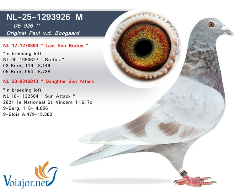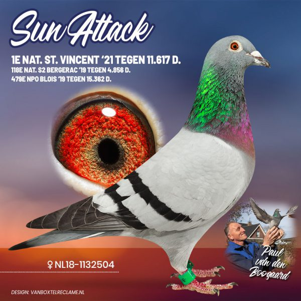 Another outstanding name is Sun Attack, winner of 1st National St. Vincent 2021, clocking as the fastest of 11,617 pigeons. Sun Attack also carries the famous bloodlines of Pair 1 and Pair 2. His grandfather is Blauw van Pau, who is therefore also the grandfather of SuperBob. The mother of Sun Attack was bred from Zoon Brutus x Geertje, a joint breeding project by Wiel and Philip Kicken.