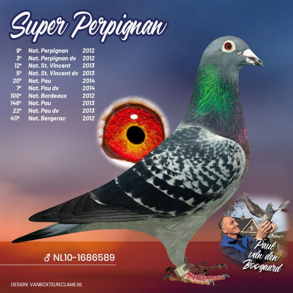 A true masterpiece of his breeding strategy – built around Pair 1 and Pair 2 – is the legendary “Super Perpignan”, regarded by Paul as the very best pigeon ever produced in his loft. His descendants perform exceptionally well, both in breeding lofts and in competition, not only for Paul himself but also for many top fanciers worldwide. A perfect example is SuperBob, bred by Bob Janssen from a son of Super Perpignan and the renowned Blauw van Pau.