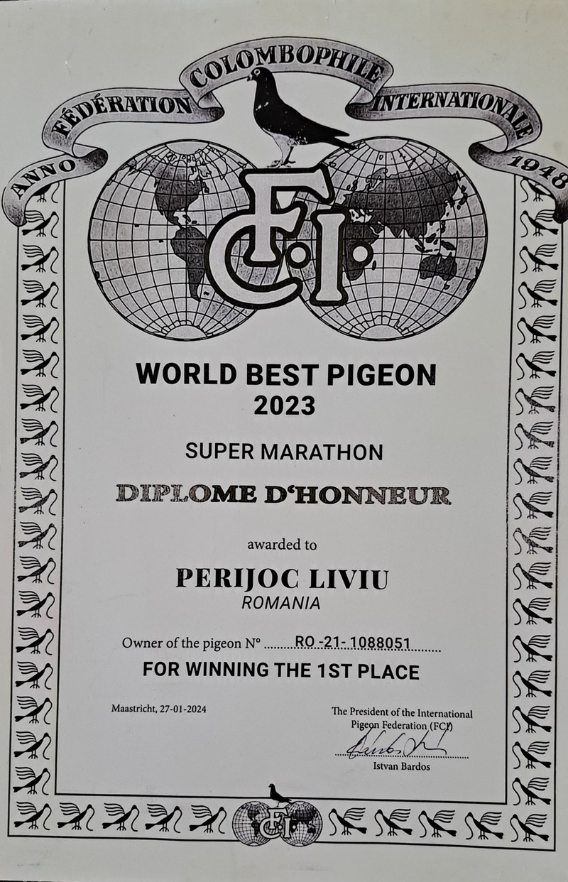 These results highlight Liviu Perijoc's long-standing consistency and success in national and provincial pigeon racing competitions, solidifying his status as an elite breeder in the extreme marathon categories.