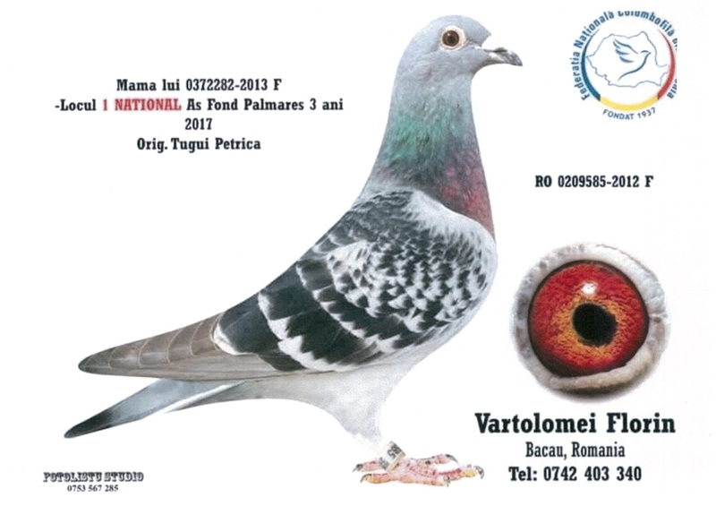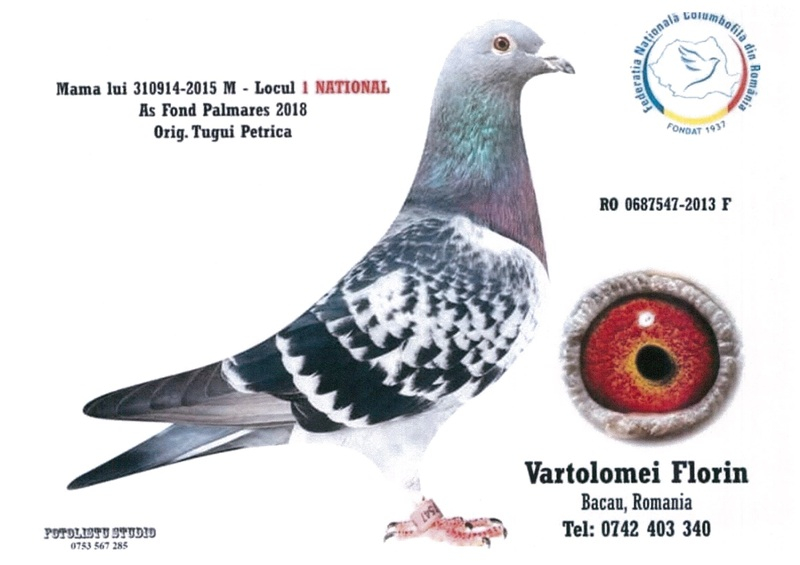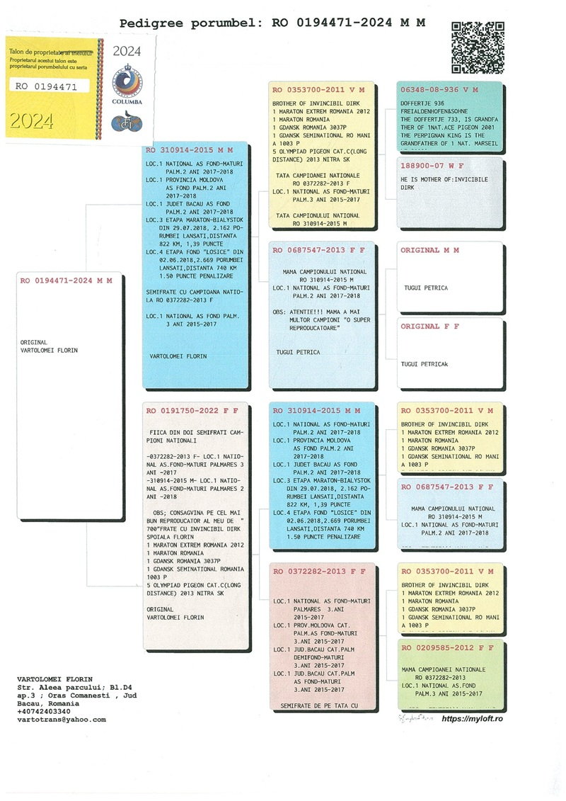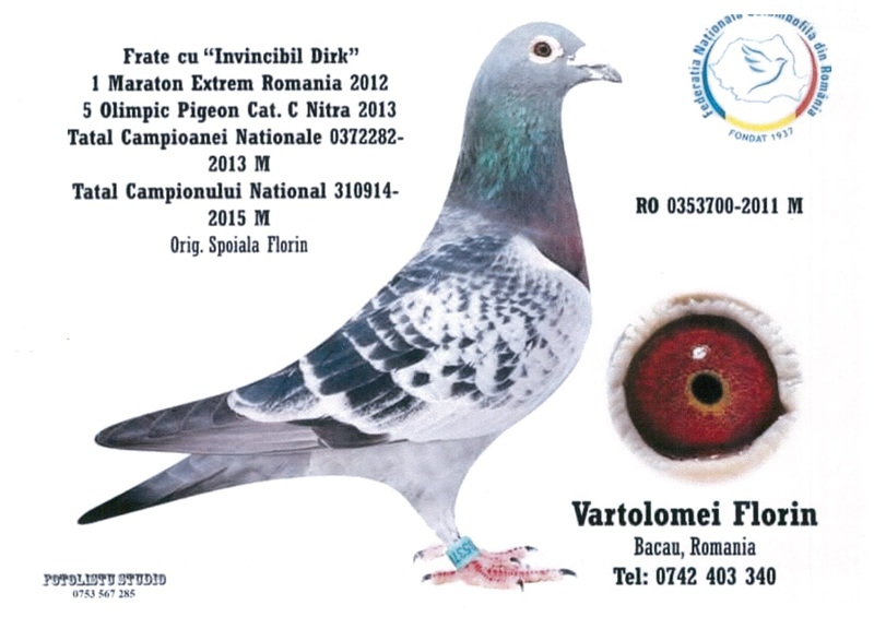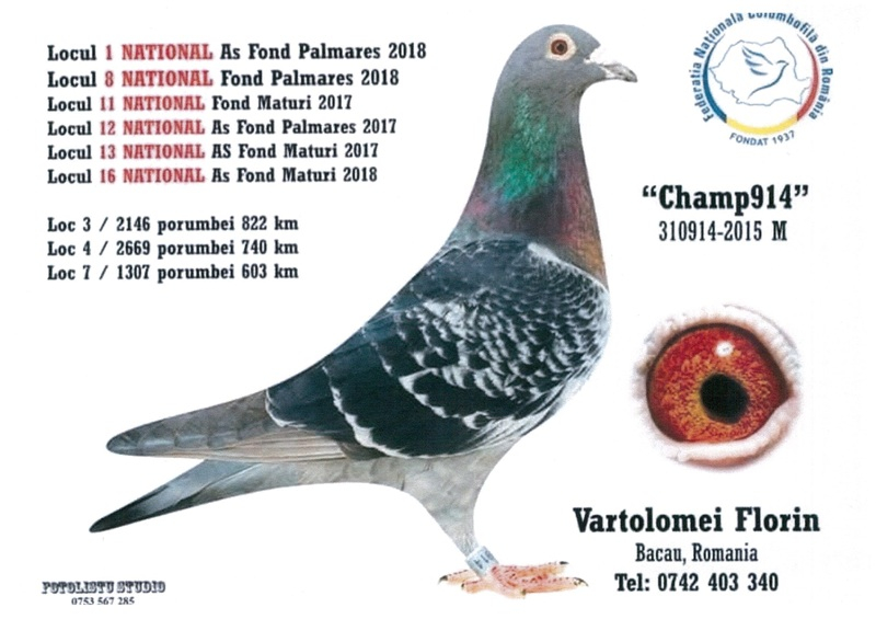 Within his lofts can be found pigeons descending from elite bloodlines, acquired from renowned fanciers both in Romania and abroad. His collaborations include distinguished members of the Professional Pigeon Fanciers Union of Romania (UCPR) and the National Federation of Pigeon Fanciers of Romania (FNCPR). Among the valuable sources of genetic material are esteemed breeders such as Cristea Sorin, Deftu Robert, Cazacu Alexandru, Botnar Ștefan, Vochin George, Tănase Ionuț, Vartolomei Florin, Melinche Iulian, Chelaru Cristinel, Bogdan Sorin, Fr. Ungureanu, Moldovan Teofil Ioan, Cătălin Antofie, Postelnicu Mihai, as well as the Bodor Family, laureates of international pigeon Olympiads.