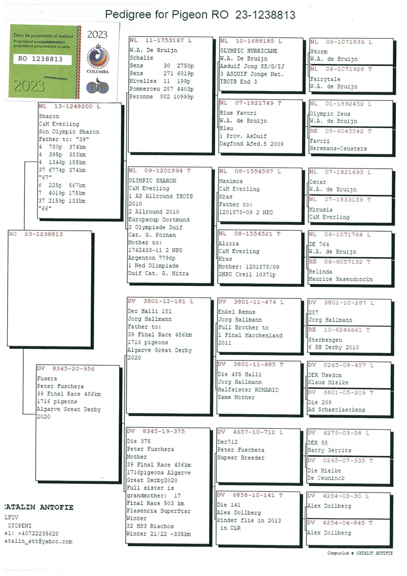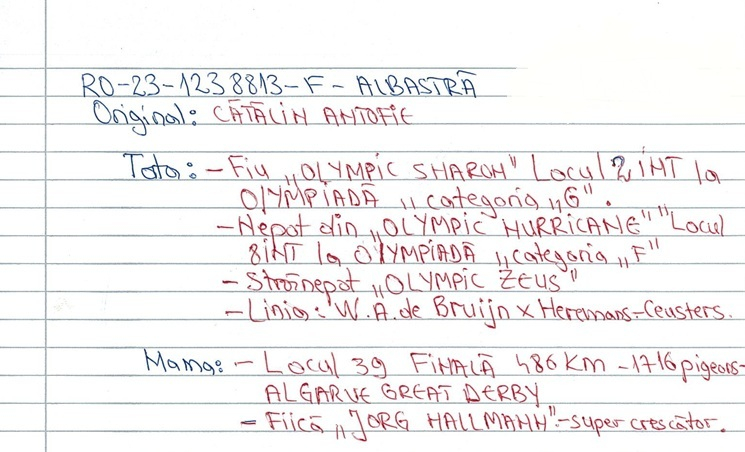 Within his lofts can be found pigeons descending from elite bloodlines, acquired from renowned fanciers both in Romania and abroad. His collaborations include distinguished members of the Professional Pigeon Fanciers Union of Romania (UCPR) and the National Federation of Pigeon Fanciers of Romania (FNCPR). Among the valuable sources of genetic material are esteemed breeders such as Cristea Sorin, Deftu Robert, Cazacu Alexandru, Botnar Ștefan, Vochin George, Tănase Ionuț, Vartolomei Florin, Melinche Iulian, Chelaru Cristinel, Bogdan Sorin, Fr. Ungureanu, Moldovan Teofil Ioan, Cătălin Antofie, Postelnicu Mihai, as well as the Bodor Family, laureates of international pigeon Olympiads.