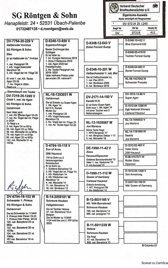 Overall, Röntgen & Sohn represents a true model of modern pigeon sport, built on proven genetics, strict selection, and long-term vision. The pigeons of this loft are not the result of chance, but the expression of a deliberate, ambitious, and extremely well-conceived breeding program—a genuine benchmark in international marathon racing, often rightly referred to as Freialdenhofen 2.0.