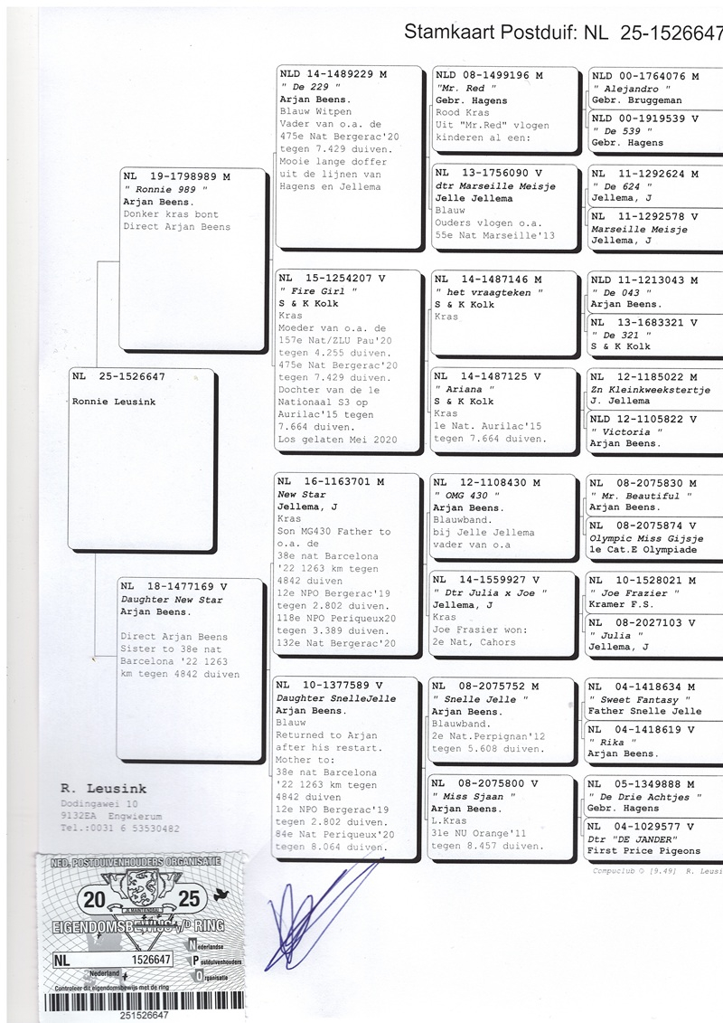 A crucial factor in Ronnie's success has been his collaboration with Arjan Beens' loft, whose birds have had a significant impact on his performance. Moreover, this collaboration has led to the formation of a lasting friendship. In his breeding compartment, there are descendants of renowned pigeons such as "Snelle Jelle," "Marianne," "Miss Gijsje," "Roodmeisje," "Mr. Bergerac," "Rika," "Dancing Moonlight," "Miss Brive," "Miss Sjaan," and "Red Thunder," contributing to the consolidation of a successful bloodline and the perpetuation of valuable genes in the world of pigeon racing.
