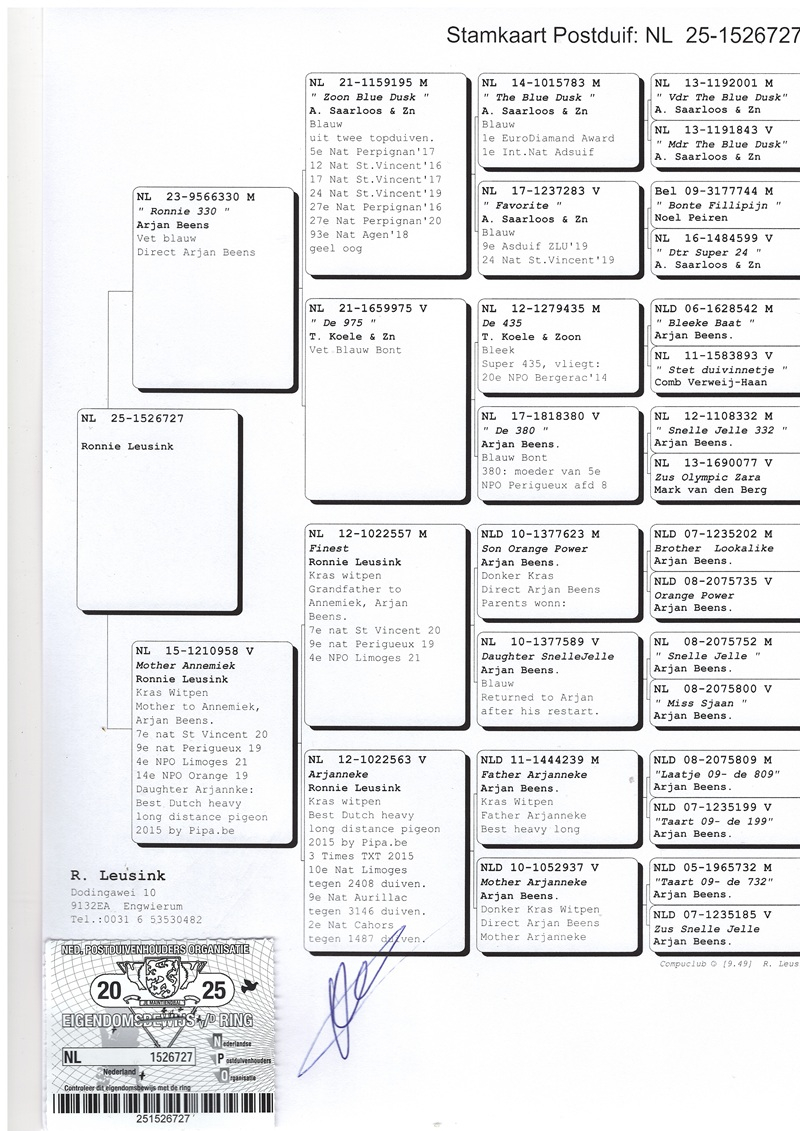 A crucial factor in Ronnie's success has been his collaboration with Arjan Beens' loft, whose birds have had a significant impact on his performance. Moreover, this collaboration has led to the formation of a lasting friendship. In his breeding compartment, there are descendants of renowned pigeons such as "Snelle Jelle," "Marianne," "Miss Gijsje," "Roodmeisje," "Mr. Bergerac," "Rika," "Dancing Moonlight," "Miss Brive," "Miss Sjaan," and "Red Thunder," contributing to the consolidation of a successful bloodline and the perpetuation of valuable genes in the world of pigeon racing.