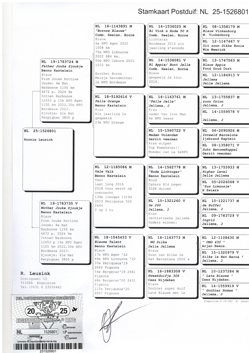 A crucial factor in Ronnie's success has been his collaboration with Arjan Beens' loft, whose birds have had a significant impact on his performance. Moreover, this collaboration has led to the formation of a lasting friendship. In his breeding compartment, there are descendants of renowned pigeons such as "Snelle Jelle," "Marianne," "Miss Gijsje," "Roodmeisje," "Mr. Bergerac," "Rika," "Dancing Moonlight," "Miss Brive," "Miss Sjaan," and "Red Thunder," contributing to the consolidation of a successful bloodline and the perpetuation of valuable genes in the world of pigeon racing.
