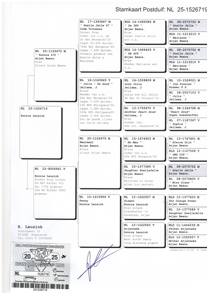 A crucial factor in Ronnie's success has been his collaboration with Arjan Beens' loft, whose birds have had a significant impact on his performance. Moreover, this collaboration has led to the formation of a lasting friendship. In his breeding compartment, there are descendants of renowned pigeons such as "Snelle Jelle," "Marianne," "Miss Gijsje," "Roodmeisje," "Mr. Bergerac," "Rika," "Dancing Moonlight," "Miss Brive," "Miss Sjaan," and "Red Thunder," contributing to the consolidation of a successful bloodline and the perpetuation of valuable genes in the world of pigeon racing.