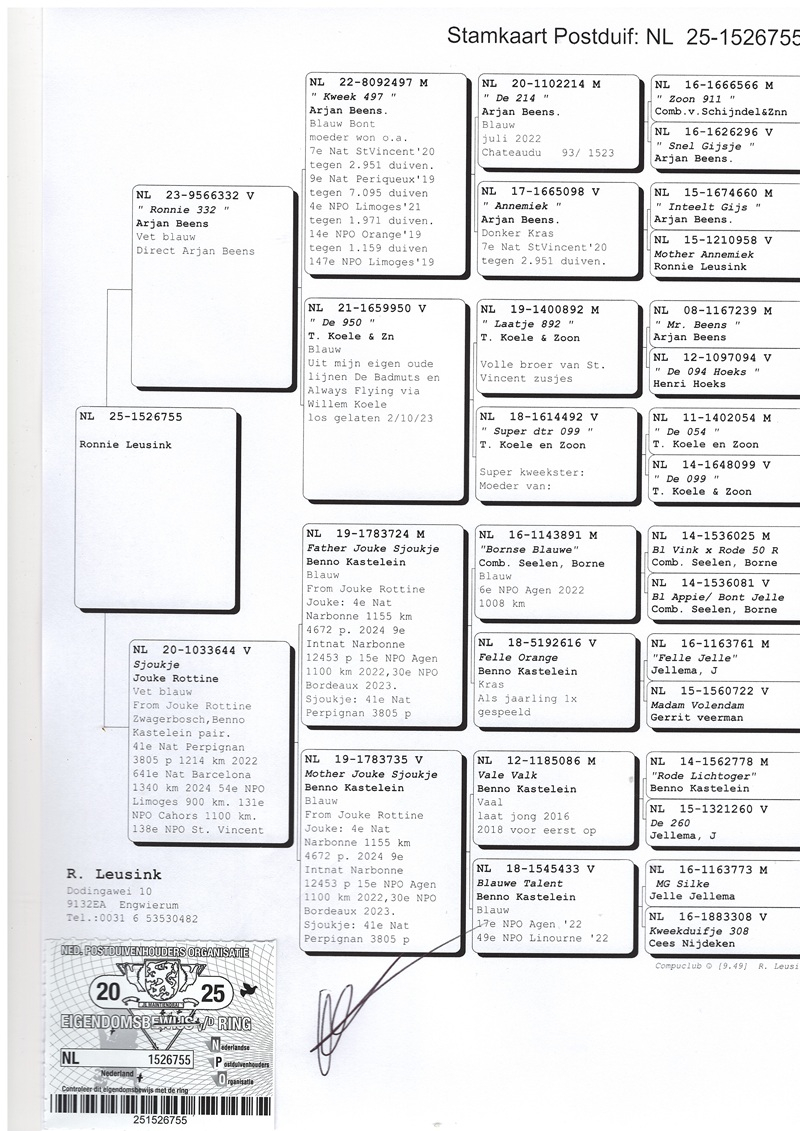 A crucial factor in Ronnie's success has been his collaboration with Arjan Beens' loft, whose birds have had a significant impact on his performance. Moreover, this collaboration has led to the formation of a lasting friendship. In his breeding compartment, there are descendants of renowned pigeons such as "Snelle Jelle," "Marianne," "Miss Gijsje," "Roodmeisje," "Mr. Bergerac," "Rika," "Dancing Moonlight," "Miss Brive," "Miss Sjaan," and "Red Thunder," contributing to the consolidation of a successful bloodline and the perpetuation of valuable genes in the world of pigeon racing.