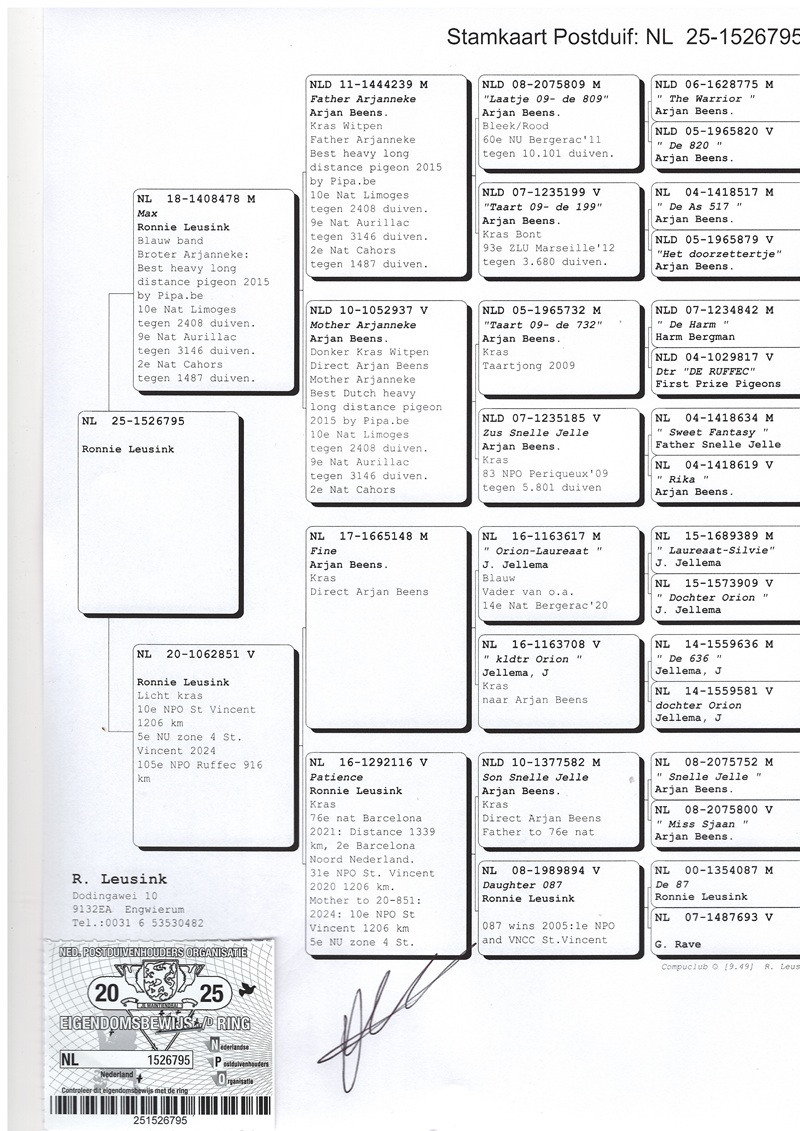 A crucial factor in Ronnie's success has been his collaboration with Arjan Beens' loft, whose birds have had a significant impact on his performance. Moreover, this collaboration has led to the formation of a lasting friendship. In his breeding compartment, there are descendants of renowned pigeons such as "Snelle Jelle," "Marianne," "Miss Gijsje," "Roodmeisje," "Mr. Bergerac," "Rika," "Dancing Moonlight," "Miss Brive," "Miss Sjaan," and "Red Thunder," contributing to the consolidation of a successful bloodline and the perpetuation of valuable genes in the world of pigeon racing.
