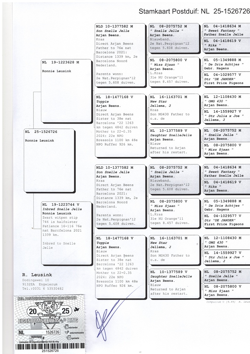 A crucial factor in Ronnie's success has been his collaboration with Arjan Beens' loft, whose birds have had a significant impact on his performance. Moreover, this collaboration has led to the formation of a lasting friendship. In his breeding compartment, there are descendants of renowned pigeons such as "Snelle Jelle," "Marianne," "Miss Gijsje," "Roodmeisje," "Mr. Bergerac," "Rika," "Dancing Moonlight," "Miss Brive," "Miss Sjaan," and "Red Thunder," contributing to the consolidation of a successful bloodline and the perpetuation of valuable genes in the world of pigeon racing.