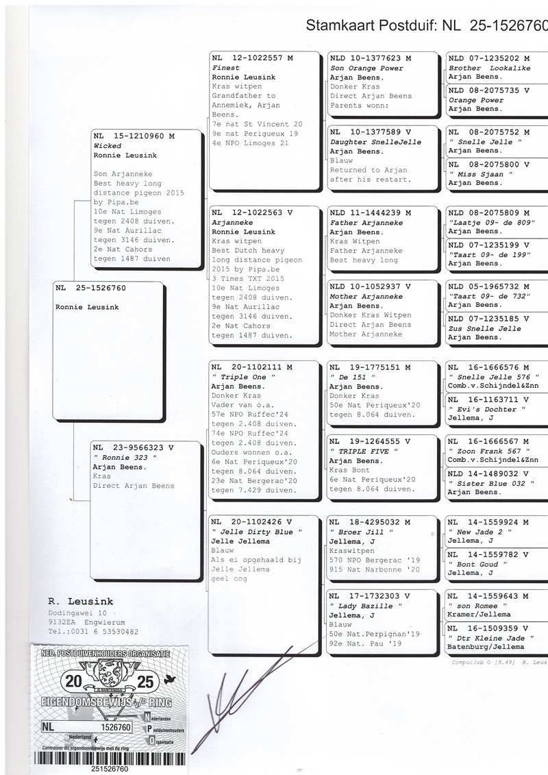 A crucial factor in Ronnie's success has been his collaboration with Arjan Beens' loft, whose birds have had a significant impact on his performance. Moreover, this collaboration has led to the formation of a lasting friendship. In his breeding compartment, there are descendants of renowned pigeons such as "Snelle Jelle," "Marianne," "Miss Gijsje," "Roodmeisje," "Mr. Bergerac," "Rika," "Dancing Moonlight," "Miss Brive," "Miss Sjaan," and "Red Thunder," contributing to the consolidation of a successful bloodline and the perpetuation of valuable genes in the world of pigeon racing.