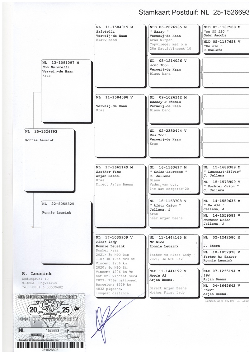 A crucial factor in Ronnie's success has been his collaboration with Arjan Beens' loft, whose birds have had a significant impact on his performance. Moreover, this collaboration has led to the formation of a lasting friendship. In his breeding compartment, there are descendants of renowned pigeons such as "Snelle Jelle," "Marianne," "Miss Gijsje," "Roodmeisje," "Mr. Bergerac," "Rika," "Dancing Moonlight," "Miss Brive," "Miss Sjaan," and "Red Thunder," contributing to the consolidation of a successful bloodline and the perpetuation of valuable genes in the world of pigeon racing.
