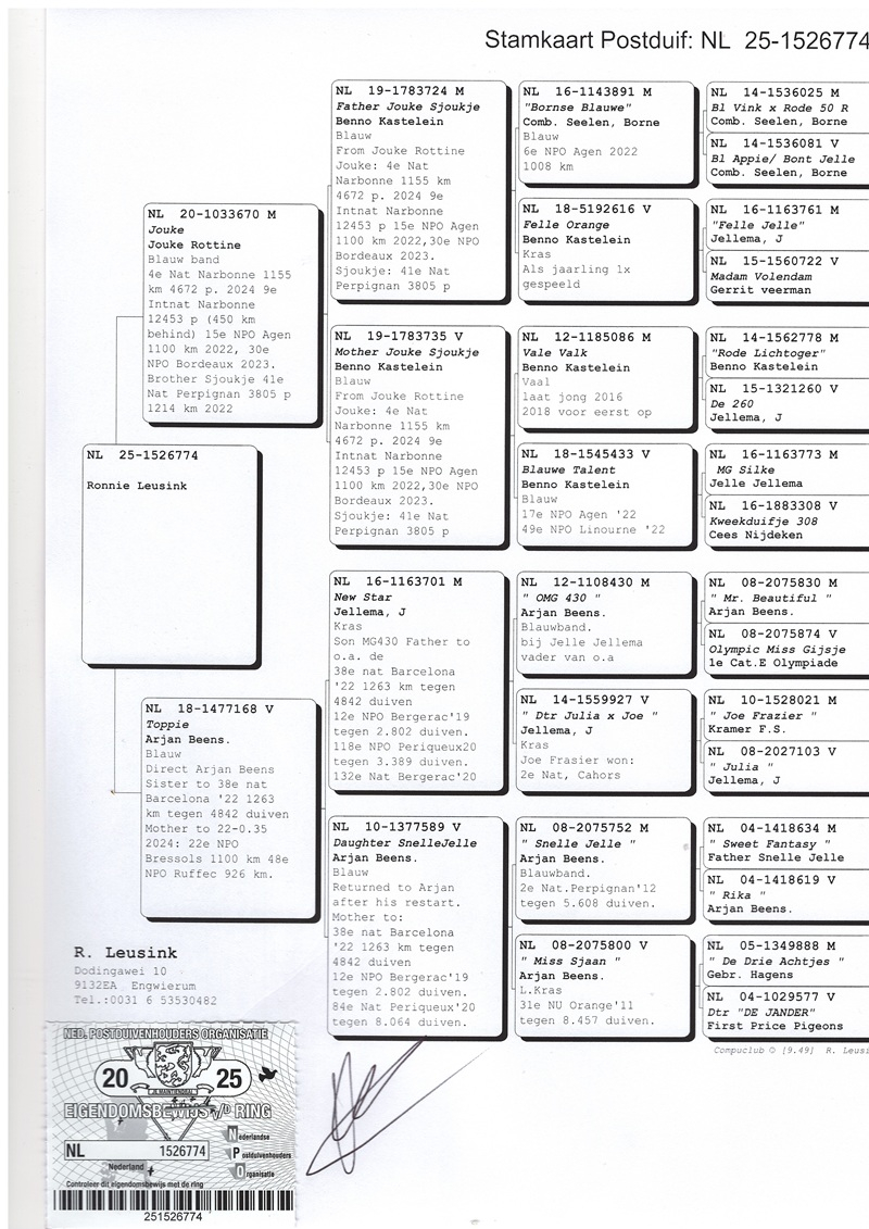 A crucial factor in Ronnie's success has been his collaboration with Arjan Beens' loft, whose birds have had a significant impact on his performance. Moreover, this collaboration has led to the formation of a lasting friendship. In his breeding compartment, there are descendants of renowned pigeons such as "Snelle Jelle," "Marianne," "Miss Gijsje," "Roodmeisje," "Mr. Bergerac," "Rika," "Dancing Moonlight," "Miss Brive," "Miss Sjaan," and "Red Thunder," contributing to the consolidation of a successful bloodline and the perpetuation of valuable genes in the world of pigeon racing.