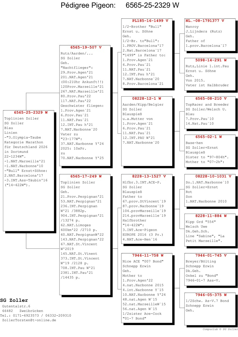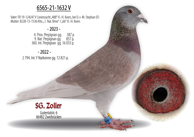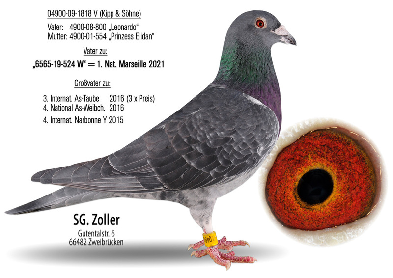 Zoller competes under the name SG Zoller, participating in both German competitions and international stages, forming a strong partnership with his wife and daughter. Their marathon pigeon lineage originates from the traditional Jan Aarden bloodlines, enhanced with birds from esteemed breeders such as Kipp, Koers, Rutz, and Batenburg.