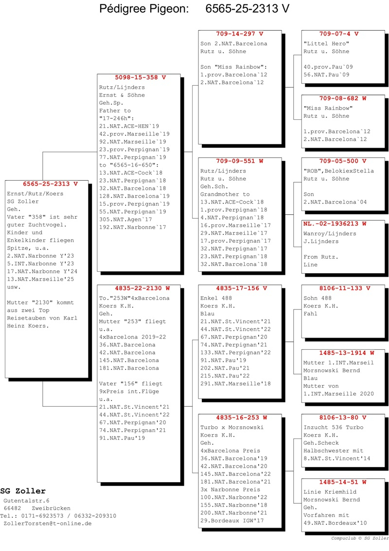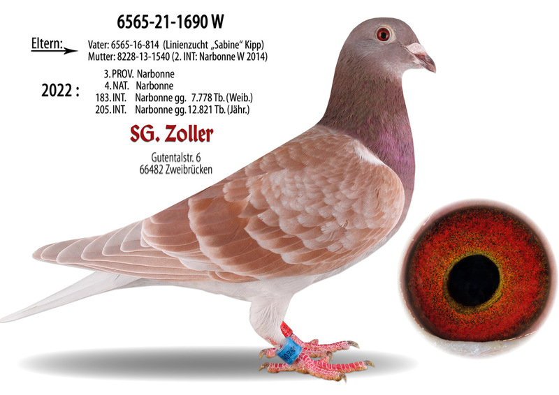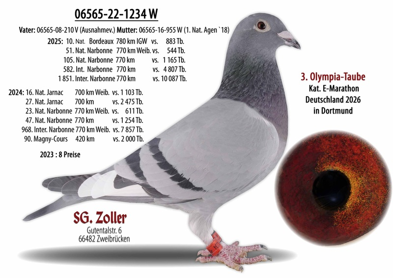 Zoller competes under the name SG Zoller, participating in both German competitions and international stages, forming a strong partnership with his wife and daughter. Their marathon pigeon lineage originates from the traditional Jan Aarden bloodlines, enhanced with birds from esteemed breeders such as Kipp, Koers, Rutz, and Batenburg.