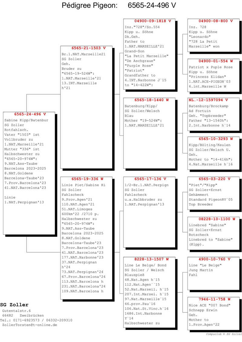 Zoller competes under the name SG Zoller, participating in both German competitions and international stages, forming a strong partnership with his wife and daughter. Their marathon pigeon lineage originates from the traditional Jan Aarden bloodlines, enhanced with birds from esteemed breeders such as Kipp, Koers, Rutz, and Batenburg.