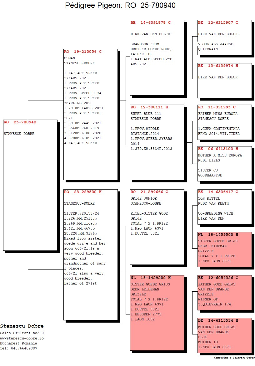 Each pigeon is accompanied by a complete pedigree, official race results, and references about prize-winning siblings, with the selection based exclusively on proven performance.