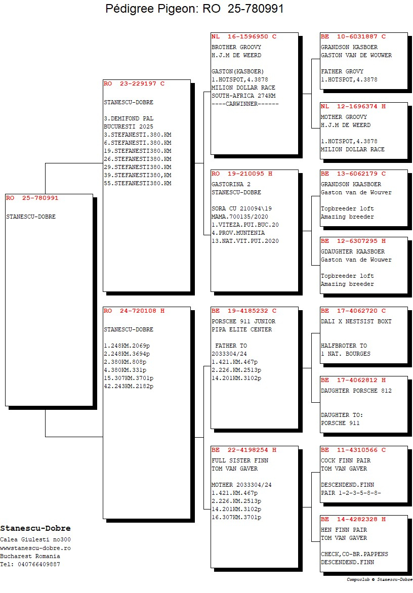 Each pigeon is accompanied by a complete pedigreeofficial race results, and references about prize-winning siblings, with the selection based exclusively on proven performance.