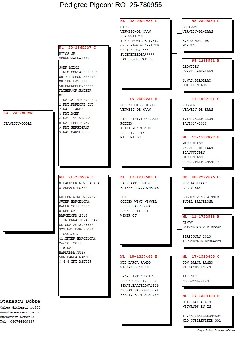 Each pigeon is accompanied by a complete pedigreeofficial race results, and references about prize-winning siblings, with the selection based exclusively on proven performance.