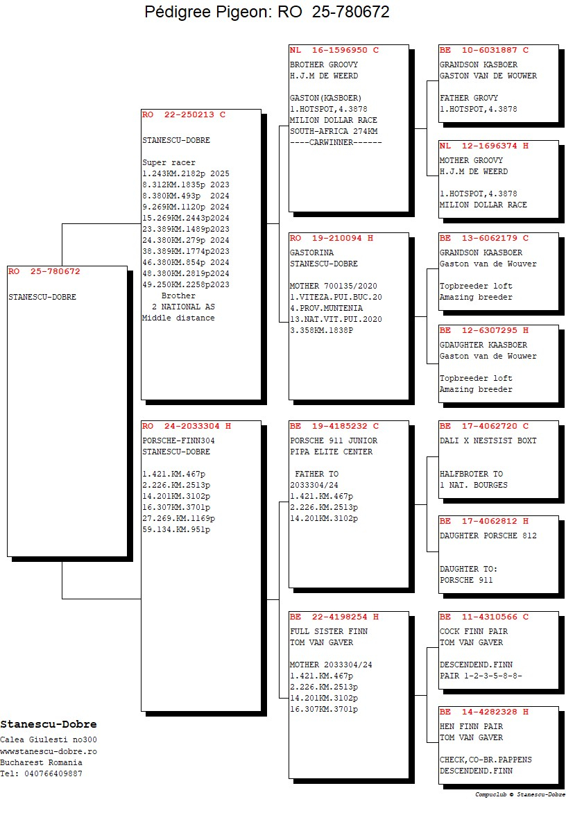 Each pigeon is accompanied by a complete pedigreeofficial race results, and references about prize-winning siblings, with the selection based exclusively on proven performance.