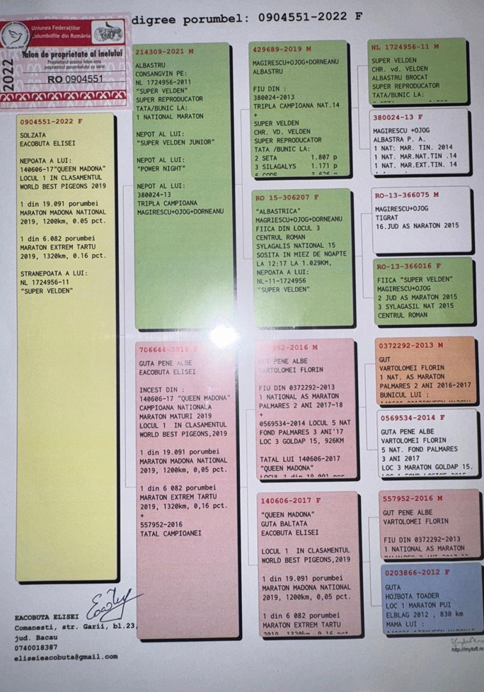 The Marean & Giosan tandem from Alba Iulia offers for sale a carefully selected lot of mature pigeons, both originals and their direct descendants, originating from renowned genetic lines specialized in marathon racing. The breeding material derives from prestigious bloodlines such as Kipp & Söhne, Freialdenhofen & Söhne, A & L van der Wegen, Jelle Jellema, and Cor de Heijde, internationally recognized for their performance and consistency. The offered specimens are of the highest quality and are particularly recommended for the establishment and consolidation of a breeding loft dedicated to marathon racing enthusiasts.