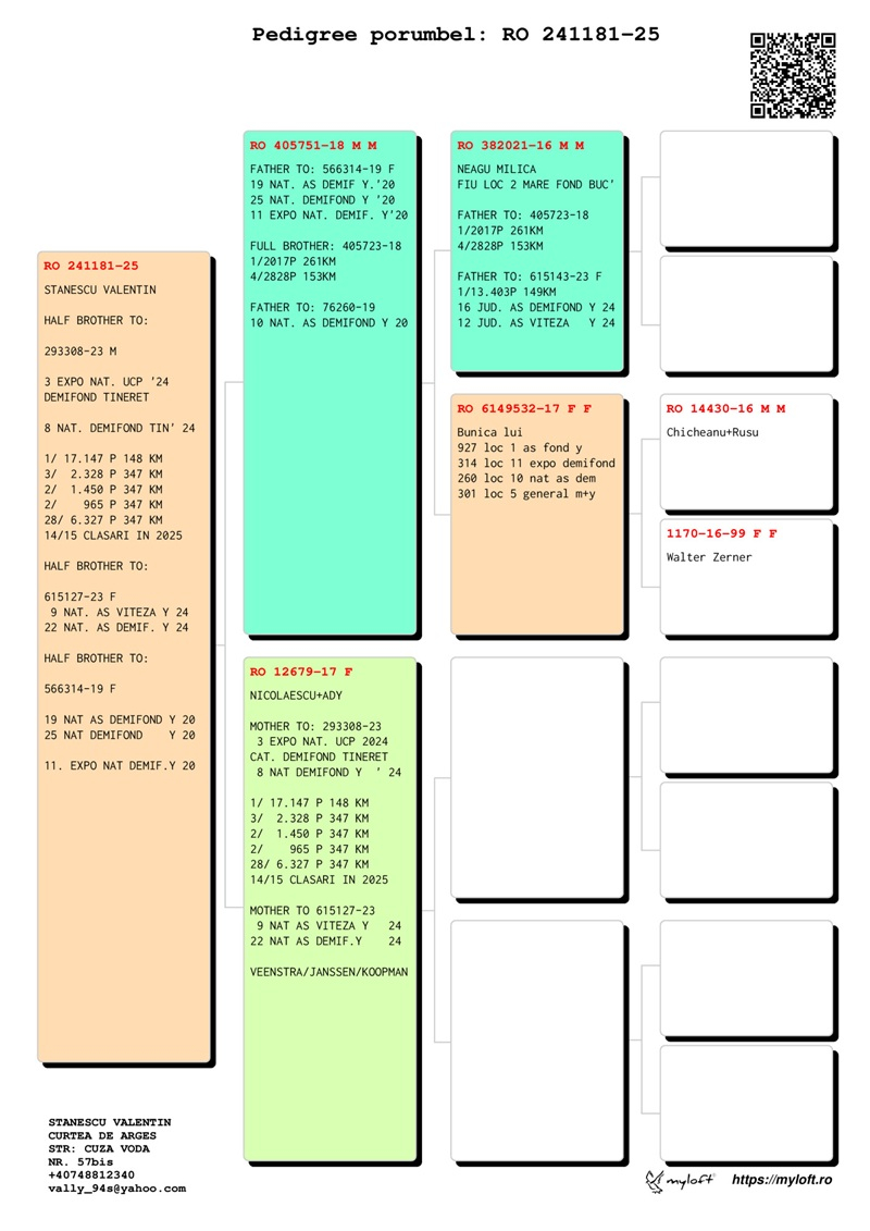 Through his consistent and diverse results, Valentin Stănescu stands out as one of the most accomplished pigeon fanciers in Romania, contributing significantly to the promotion of the national pigeon sport and to strengthening the prestige of Argeș County in competitive pigeon racing.