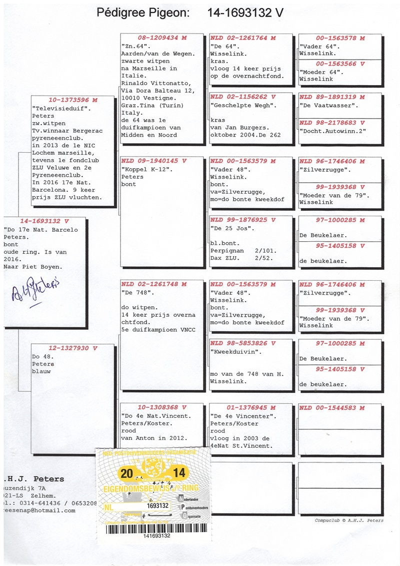 The foundations of the loft were laid as early as 1982–1983, with pigeons from Gradje Roeffen (Wanroy blood, Jeu Vervuurt). From this line came the famous “Goeie 03”, a cock with 15 marathon prizes, great-grandfather of the legendary “Rode Teletekst”.
