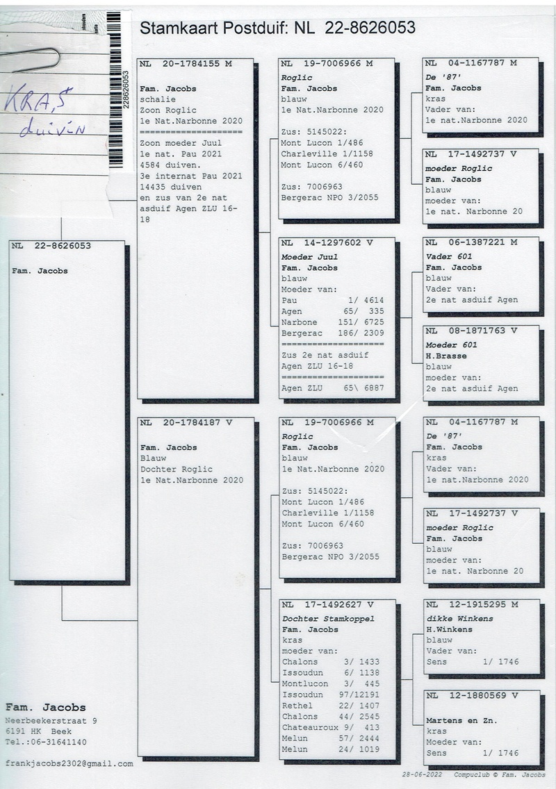The foundations of the loft were laid as early as 1982–1983, with pigeons from Gradje Roeffen (Wanroy blood, Jeu Vervuurt). From this line came the famous “Goeie 03”, a cock with 15 marathon prizes, great-grandfather of the legendary “Rode Teletekst”.