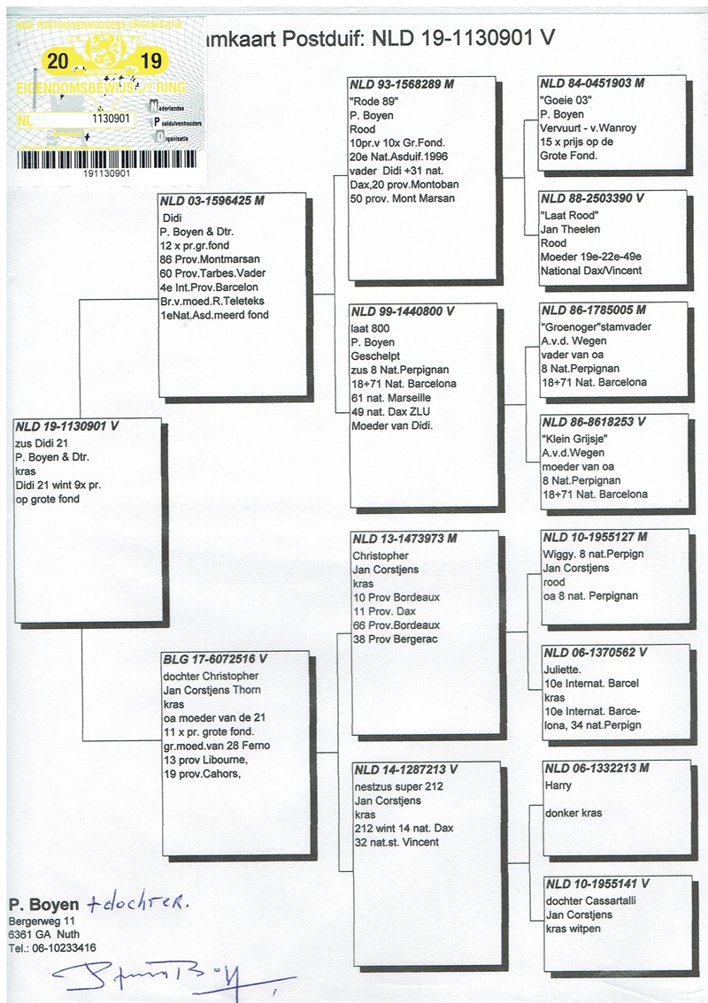 Operating under the name Piet Boyen & Daughter since 2002 at the parental loft in Nuth, Piet Boyen continues a tradition initiated by his father. After a period of independent competition in Schimmert, focused exclusively on extreme marathon races, a legendary father–son partnership followed, resulting in repeated top rankings in the national Fondspiegel classifications, culminating in 1st place during the period 1996–1998. Out of respect for his father, who passed away in 2002, Piet retained the loft’s name and transformed it into a benchmark of Dutch marathon racing.
