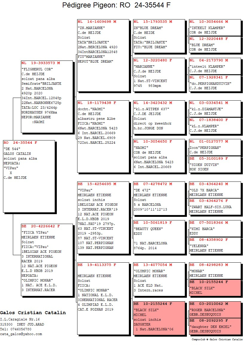 Lotul său competițional se bazează pe linii genetice consacrate la nivel internațional, provenite din crescătorii de prestigiu precum Nouwen-Paessen, Kuijpers, Van der Wegen și Materne. În ultimii ani, crescătoria a fost consolidată prin introducerea porumbeilor din renumita linie Cor de Heijde, demers care a contribuit semnificativ la creșterea valorii genetice și a potențialului sportiv al efectivului.