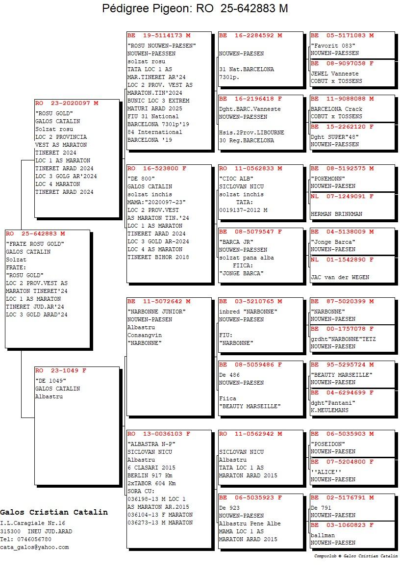 Ansamblul acestor rezultate evidențiază nu doar profesionalismul și consecvența în activitatea columbofilă, ci și o strategie bine definită de selecție genetică, pregătire și management sportiv. Performanțele obținute de porumbeii săi confirmă poziția lui Galoș Cătălin printre crescătorii de referință din regiune și contribuie la consolidarea prestigiului competițiilor de maraton și maraton extrem din România.