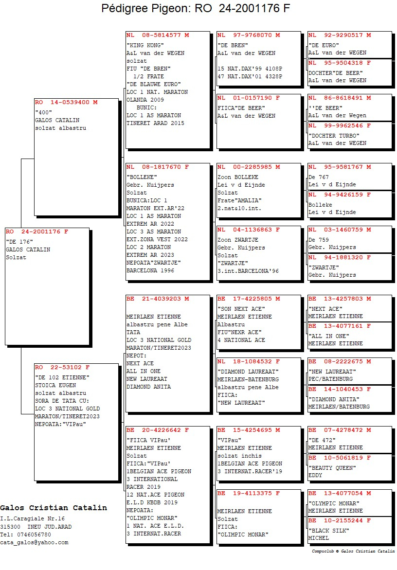 Ansamblul acestor rezultate evidențiază nu doar profesionalismul și consecvența în activitatea columbofilă, ci și o strategie bine definită de selecție genetică, pregătire și management sportiv. Performanțele obținute de porumbeii săi confirmă poziția lui Galoș Cătălin printre crescătorii de referință din regiune și contribuie la consolidarea prestigiului competițiilor de maraton și maraton extrem din România.