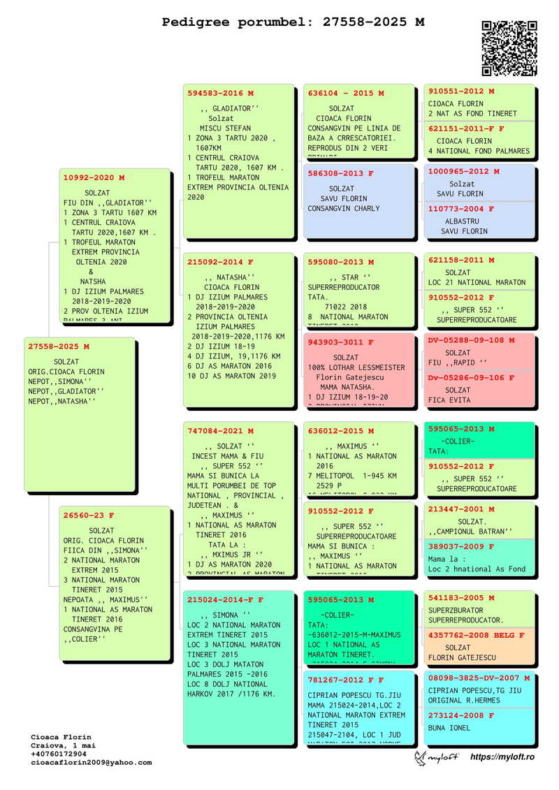 Pasionat de columbofilie încă din tinerețe, Cioacă Florin a transformat o pasiune într-o adevărată știință a performanței. Printr-o selecție riguroasă, bazată pe criterii genetice bine fundamentate, și printr-un antrenament metodic, a reușit să creeze o linie de porumbei recunoscută pentru echilibru, forță și spirit competițional. Rezultatele sale nu sunt întâmplătoare, ci rodul unei munci susținute, al disciplinei și al unei viziuni clare asupra direcției pe care trebuie să o urmeze columbofilia de performanță.