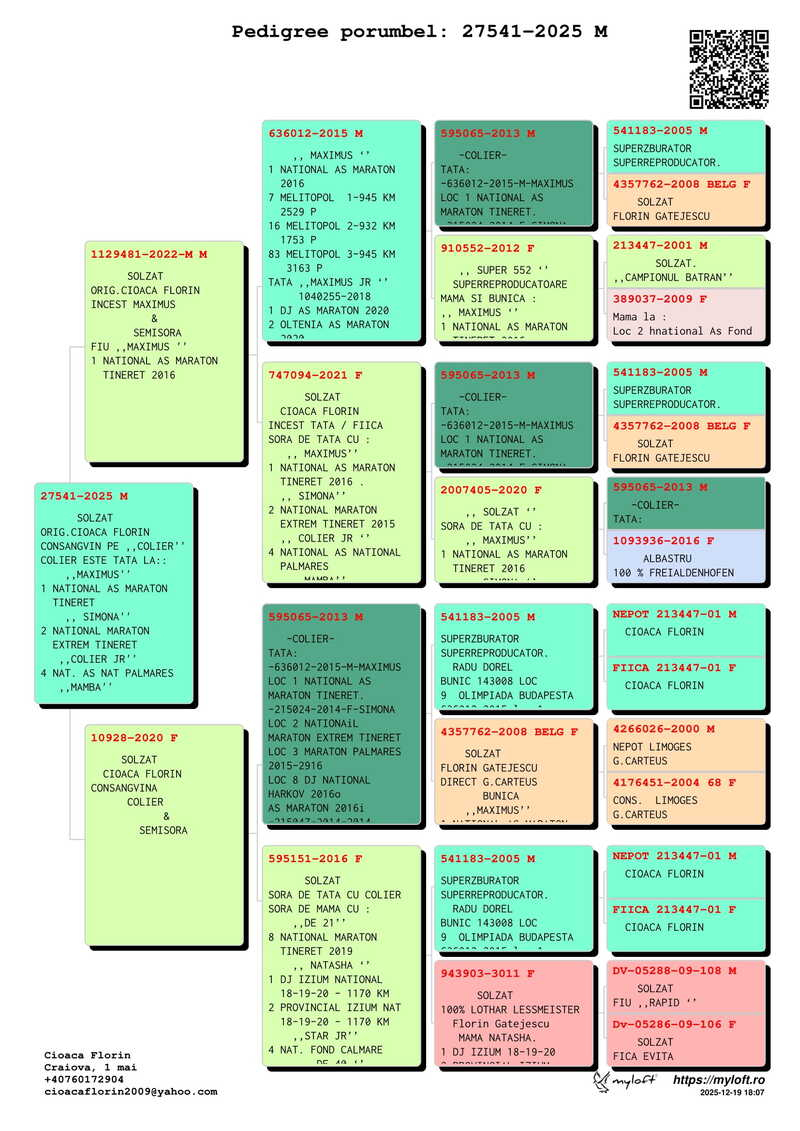 De-a lungul carierei sale, Cioacă Florin a obținut o serie impresionantă de titluri și clasări de top, atât la nivel individual, cât și ca crescător. Printre acestea se numără participarea la Lotul Olimpic Național (Categoria E Maraton, 2014) și Locul 9 la Olimpiada Columbofilă de la Budapesta (2015) – rezultate care îl plasează în elita mondială a columbofililor. De asemenea, numeroase titluri de Național Maraton PalmaresNațional Fond TineretNațional As Maraton și clasări constante în Top 10 Național confirmă consistența și valoarea liniei sale de zbor.
