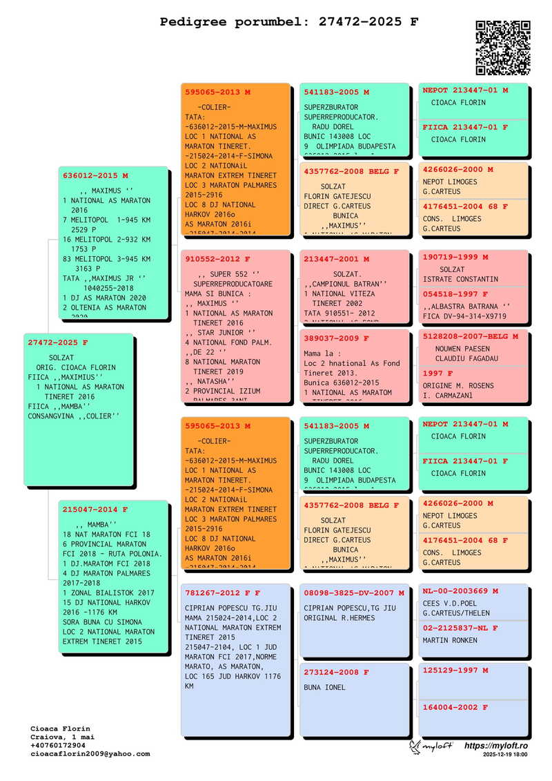 De-a lungul carierei sale, Cioacă Florin a obținut o serie impresionantă de titluri și clasări de top, atât la nivel individual, cât și ca crescător. Printre acestea se numără participarea la Lotul Olimpic Național (Categoria E Maraton, 2014) și Locul 9 la Olimpiada Columbofilă de la Budapesta (2015) – rezultate care îl plasează în elita mondială a columbofililor. De asemenea, numeroase titluri de Național Maraton PalmaresNațional Fond TineretNațional As Maraton și clasări constante în Top 10 Național confirmă consistența și valoarea liniei sale de zbor.