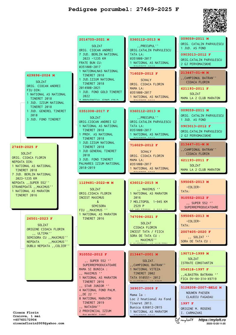 De-a lungul carierei sale, Cioacă Florin a obținut o serie impresionantă de titluri și clasări de top, atât la nivel individual, cât și ca crescător. Printre acestea se numără participarea la Lotul Olimpic Național (Categoria E Maraton, 2014) și Locul 9 la Olimpiada Columbofilă de la Budapesta (2015) – rezultate care îl plasează în elita mondială a columbofililor. De asemenea, numeroase titluri de Național Maraton PalmaresNațional Fond TineretNațional As Maraton și clasări constante în Top 10 Național confirmă consistența și valoarea liniei sale de zbor.