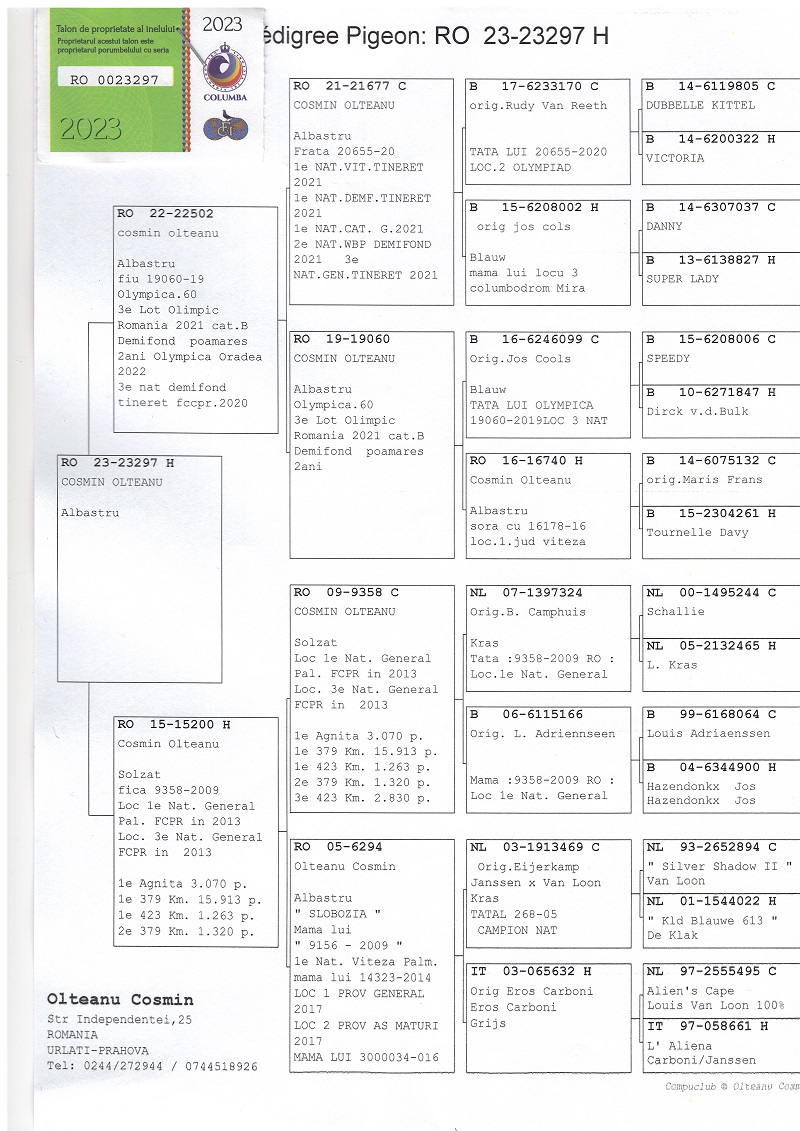 Cosmin Olteanu a oferit informații valoroase despre originile acestor campioane. Campioana națională provine dintr-un mascul Rudy Van Reeth, având o mamă de la Jos Cools. Cealaltă femelă este reprodusă dintr-un mascul tot de la Jos Cools, având o mamă remarcabilă, femela 484, o olimpică consacrată în crescătoria sa. Aceste detalii subliniază faptul că succesul columbofilului prahovean nu este întâmplător, ci rezultatul unei selecții și îngrijiri atente a porumbeilor săi.