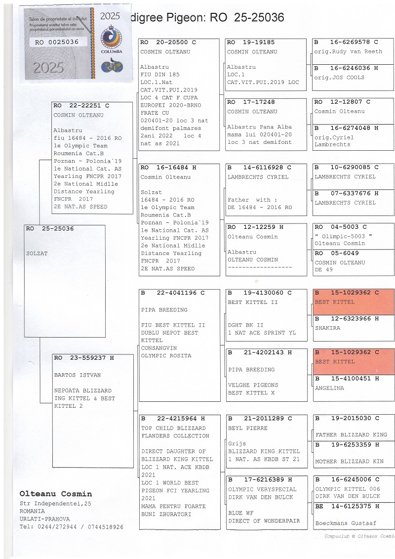 Cosmin Olteanu a oferit informații valoroase despre originile acestor campioane. Campioana națională provine dintr-un mascul Rudy Van Reeth, având o mamă de la Jos Cools. Cealaltă femelă este reprodusă dintr-un mascul tot de la Jos Cools, având o mamă remarcabilă, femela 484, o olimpică consacrată în crescătoria sa. Aceste detalii subliniază faptul că succesul columbofilului prahovean nu este întâmplător, ci rezultatul unei selecții și îngrijiri atente a porumbeilor săi.