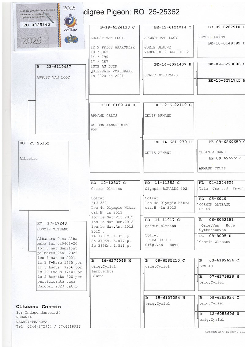 Cosmin Olteanu a oferit informații valoroase despre originile acestor campioane. Campioana națională provine dintr-un mascul Rudy Van Reeth, având o mamă de la Jos Cools. Cealaltă femelă este reprodusă dintr-un mascul tot de la Jos Cools, având o mamă remarcabilă, femela 484, o olimpică consacrată în crescătoria sa. Aceste detalii subliniază faptul că succesul columbofilului prahovean nu este întâmplător, ci rezultatul unei selecții și îngrijiri atente a porumbeilor săi.