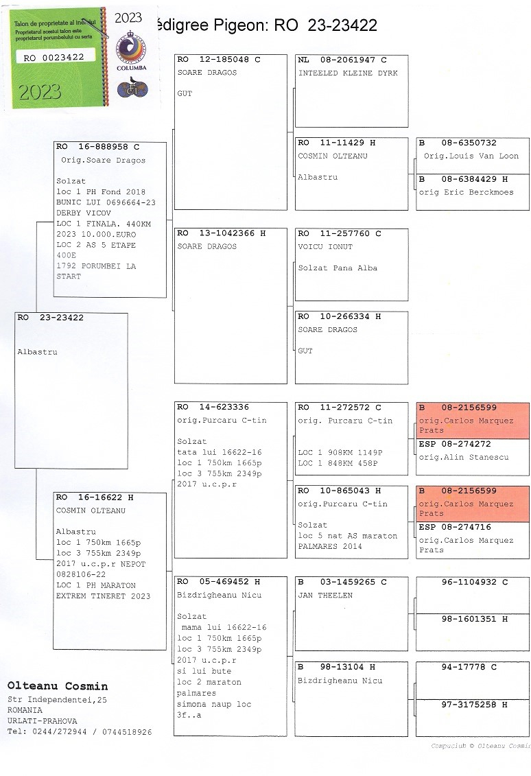 Originea acestor performanțe remarcabile nu este întâmplătoare: campioana provine dintr-un mascul Rudy Van Reeth și o femelă de la Jos Cools, iar vicecampioana dintr-un mascul Jos Cools și celebra femelă 484, o olimpică din propria crescătorie.