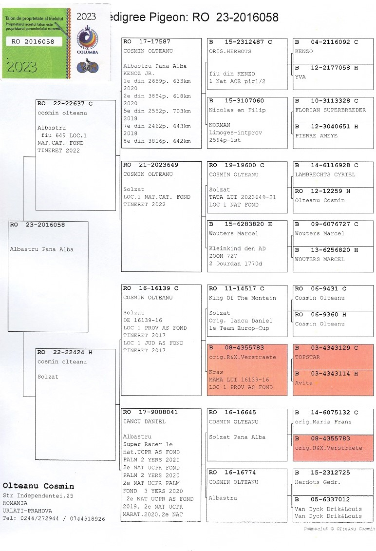 Originea acestor performanțe remarcabile nu este întâmplătoare: campioana provine dintr-un mascul Rudy Van Reeth și o femelă de la Jos Cools, iar vicecampioana dintr-un mascul Jos Cools și celebra femelă 484, o olimpică din propria crescătorie.