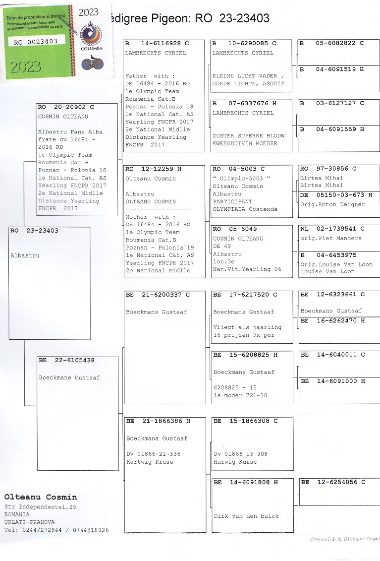 Originea acestor performanțe remarcabile nu este întâmplătoare: campioana provine dintr-un mascul Rudy Van Reeth și o femelă de la Jos Cools, iar vicecampioana dintr-un mascul Jos Cools și celebra femelă 484, o olimpică din propria crescătorie.