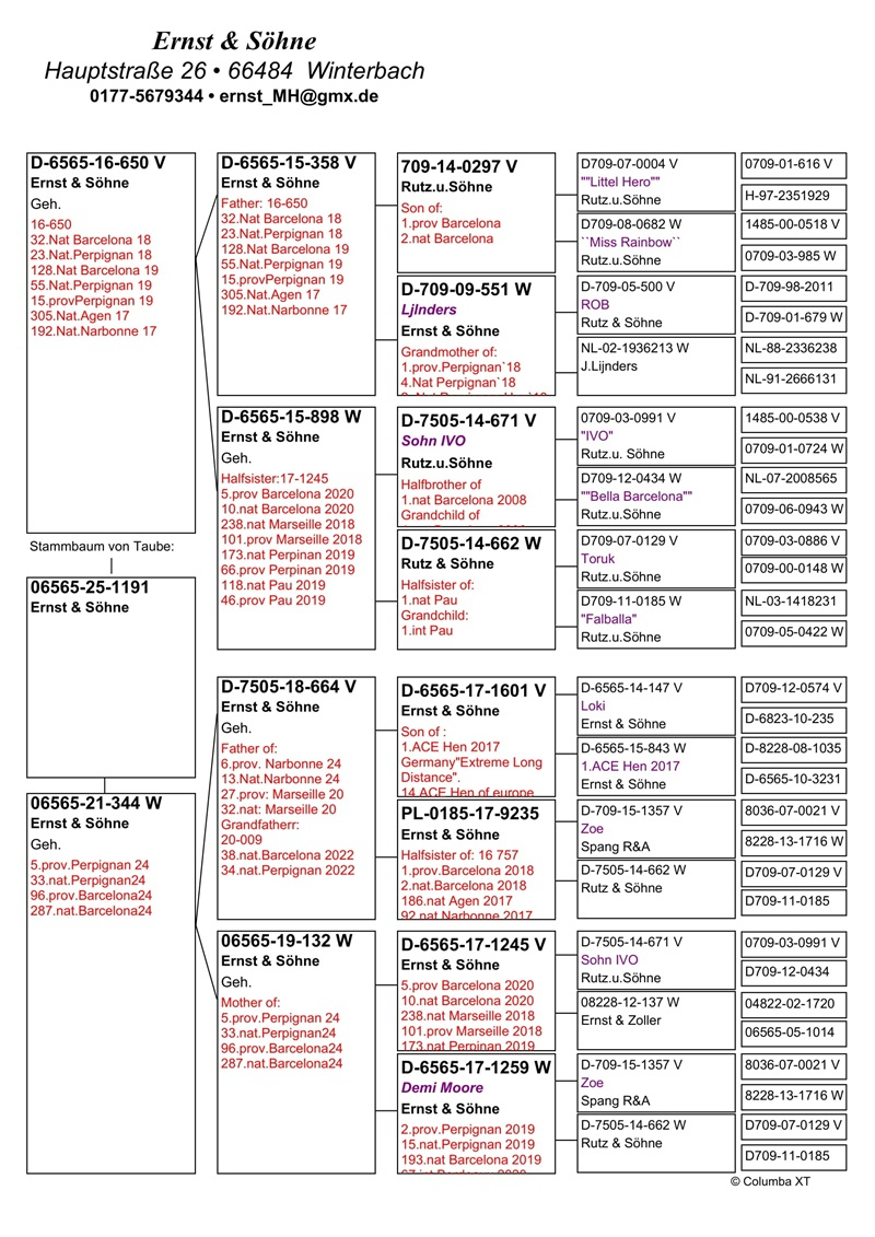 Performanțele constante au fost confirmate și prin clasări de top în ierarhiile naționale germane. În anul 2019, familia Ernst a ocupat locul al treilea în clasamentul național pentru cursele internaționale, cu rezultate remarcabile la etape precum Pau, Barcelona, Saint Vincent, Marseille, Narbonne, Brive și Perpignan. În 2020, echipa s-a situat pe locul 20 în clasamentul național al curselor internaționale, obținând totodată titlul de Porumbel Ace nr. 1 al Germaniei la această categorie.