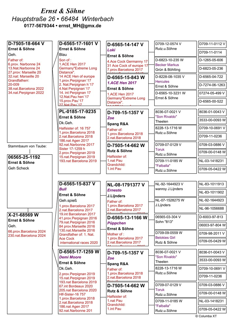 Performanțele constante au fost confirmate și prin clasări de top în ierarhiile naționale germane. În anul 2019, familia Ernst a ocupat locul al treilea în clasamentul național pentru cursele internaționale, cu rezultate remarcabile la etape precum Pau, Barcelona, Saint Vincent, Marseille, Narbonne, Brive și Perpignan. În 2020, echipa s-a situat pe locul 20 în clasamentul național al curselor internaționale, obținând totodată titlul de Porumbel Ace nr. 1 al Germaniei la această categorie.
