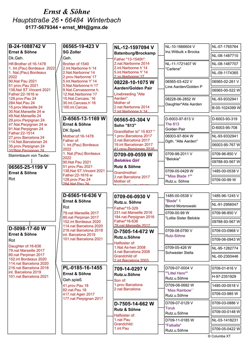 Până în 2023, familia Ernst și-a menținut nivelul ridicat de performanță, obținând clasări de frunte la competiții importante precum Barcelona, Arcis-sur-Aube, Vivonne, Auxerre și Saint Dizier, atât pe plan național, cât și internațional. Această constanță reflectă nu doar valoarea genetică a porumbeilor, ci și rigoarea, devotamentul și pasiunea care definesc activitatea familiei Ernst, confirmând statutul său de model de excelență în columbofilie.