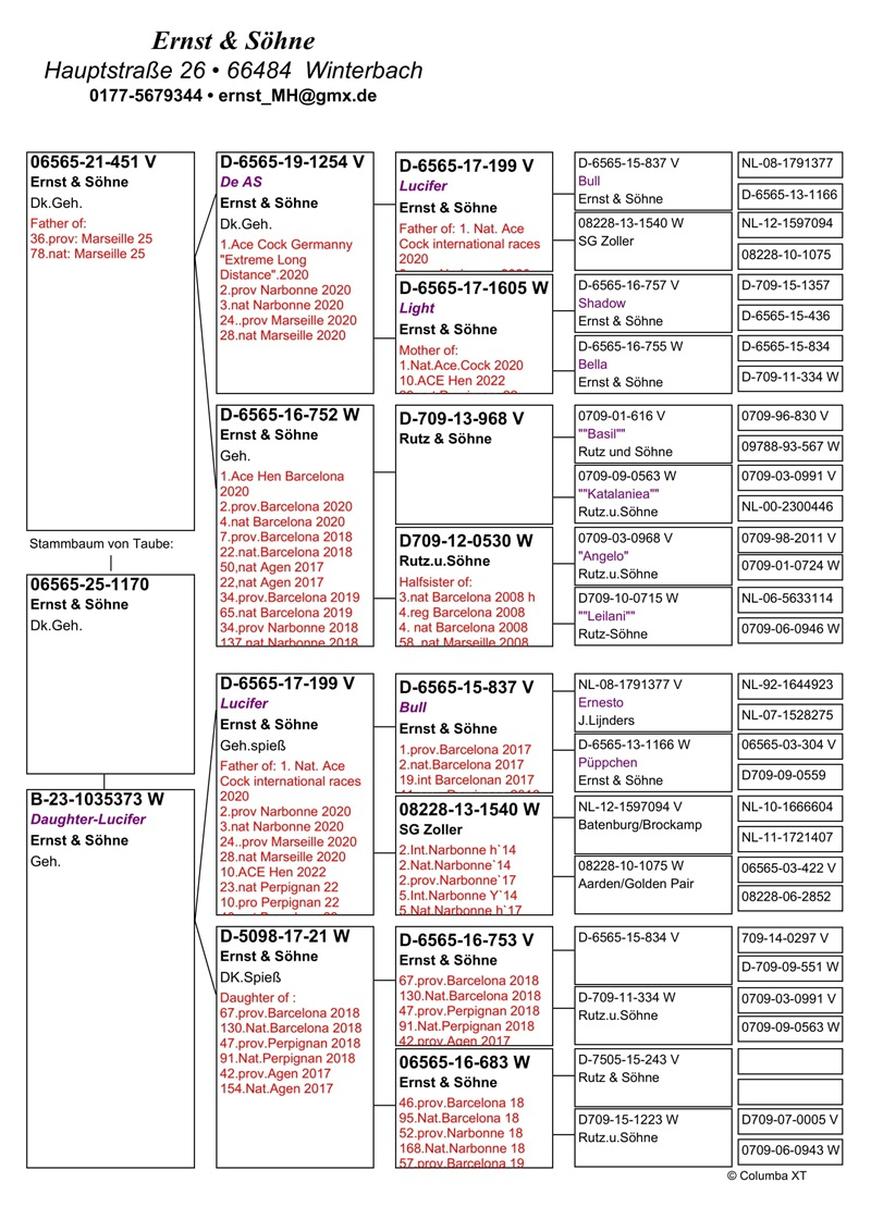 Performanțele constante au fost confirmate și prin clasări de top în ierarhiile naționale germane. În anul 2019, familia Ernst a ocupat locul al treilea în clasamentul național pentru cursele internaționale, cu rezultate remarcabile la etape precum Pau, Barcelona, Saint Vincent, Marseille, Narbonne, Brive și Perpignan. În 2020, echipa s-a situat pe locul 20 în clasamentul național al curselor internaționale, obținând totodată titlul de Porumbel Ace nr. 1 al Germaniei la această categorie.