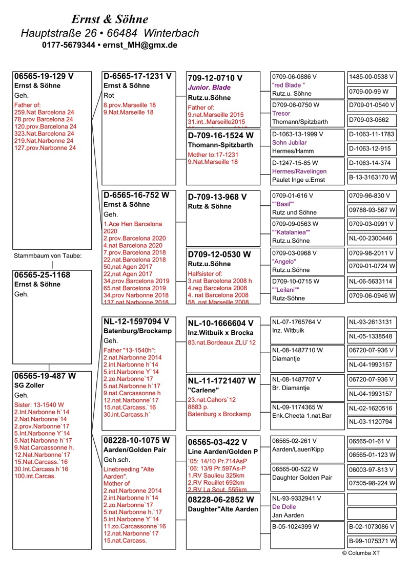 Performanțele constante au fost confirmate și prin clasări de top în ierarhiile naționale germane. În anul 2019, familia Ernst a ocupat locul al treilea în clasamentul național pentru cursele internaționale, cu rezultate remarcabile la etape precum Pau, Barcelona, Saint Vincent, Marseille, Narbonne, Brive și Perpignan. În 2020, echipa s-a situat pe locul 20 în clasamentul național al curselor internaționale, obținând totodată titlul de Porumbel Ace nr. 1 al Germaniei la această categorie.