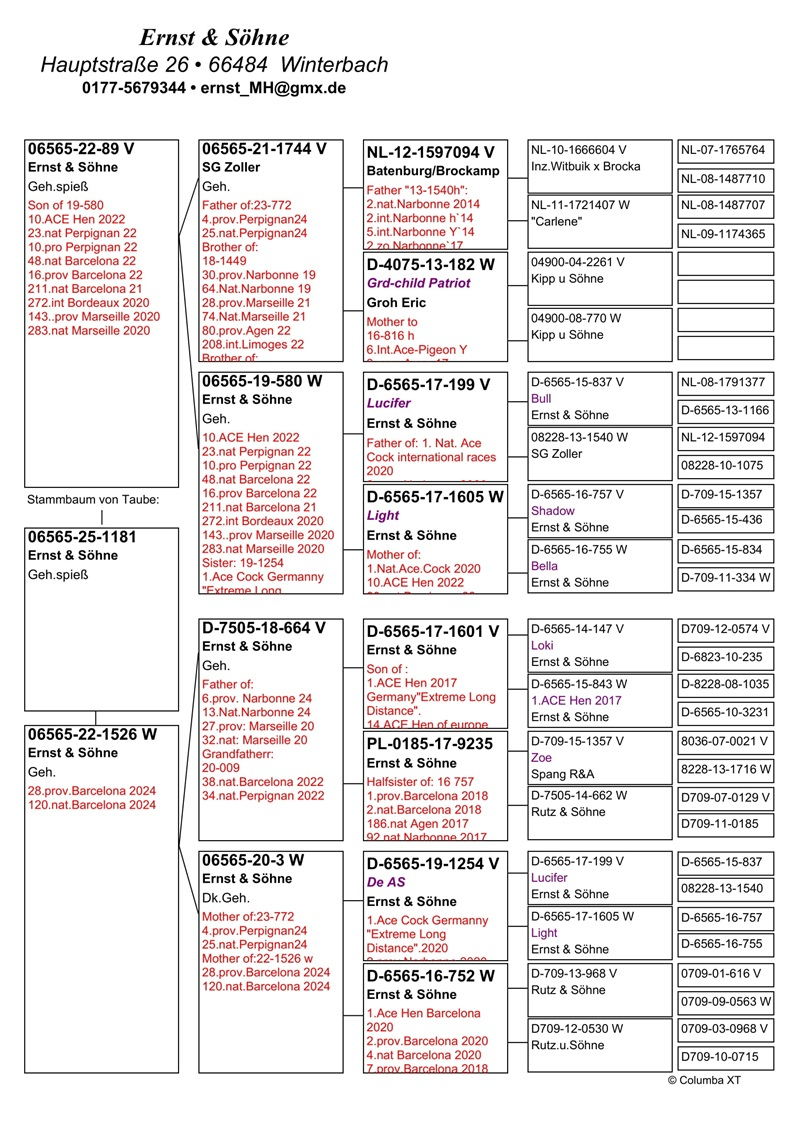 Performanțele constante au fost confirmate și prin clasări de top în ierarhiile naționale germane. În anul 2019, familia Ernst a ocupat locul al treilea în clasamentul național pentru cursele internaționale, cu rezultate remarcabile la etape precum Pau, Barcelona, Saint Vincent, Marseille, Narbonne, Brive și Perpignan. În 2020, echipa s-a situat pe locul 20 în clasamentul național al curselor internaționale, obținând totodată titlul de Porumbel Ace nr. 1 al Germaniei la această categorie.