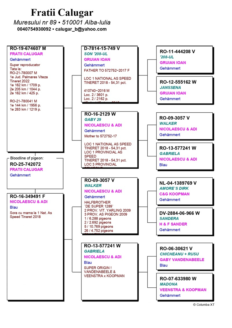 Frații Călugăr reprezintă un tandem columbofil cu o experiență solidă și o activitate constantă, construită prin muncă susținută și pasiune autentică pentru porumbeii voiajori. De-a lungul anilor, aceștia au acumulat numeroase rezultate remarcabile la nivel județean, provincial și național, impunându-se la categoriile Viteză, Demifond și General, în condiții variate de zbor și competiție.