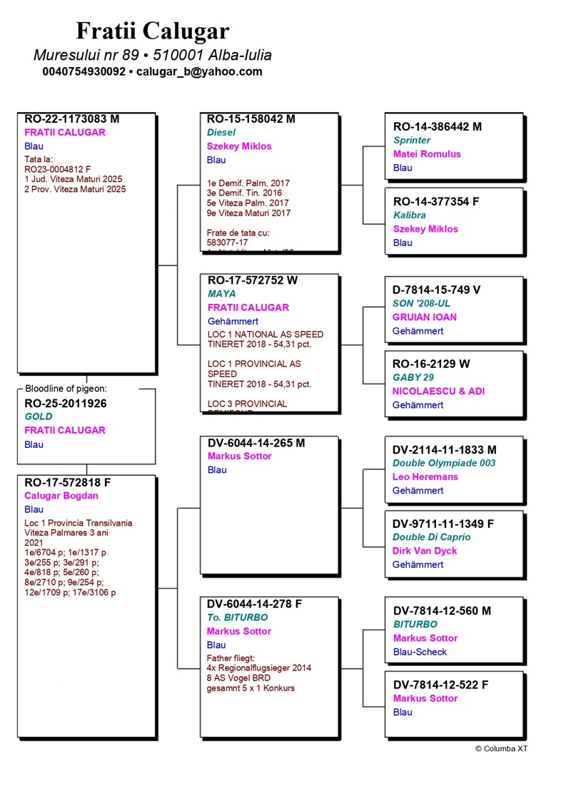 Frații Călugăr reprezintă un tandem columbofil cu o experiență solidă și o activitate constantă, construită prin muncă susținută și pasiune autentică pentru porumbeii voiajori. De-a lungul anilor, aceștia au acumulat numeroase rezultate remarcabile la nivel județean, provincial și național, impunându-se la categoriile Viteză, Demifond și General, în condiții variate de zbor și competiție.